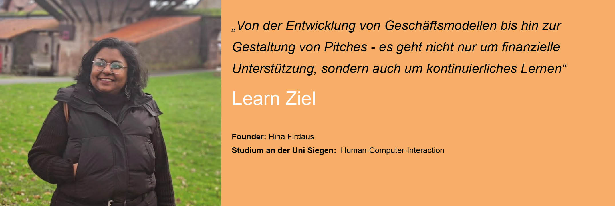 Hina Firdaus absolviert ihren Master in Human-Computer-Interaction an der Universität Siegen. Learn Ziel ist eine Bildungstechnologie-Plattform, die aus Hinas Erfahrung als Dozentin entstanden ist und sich speziell an Studierende mit Lernschwierigkeiten richtet