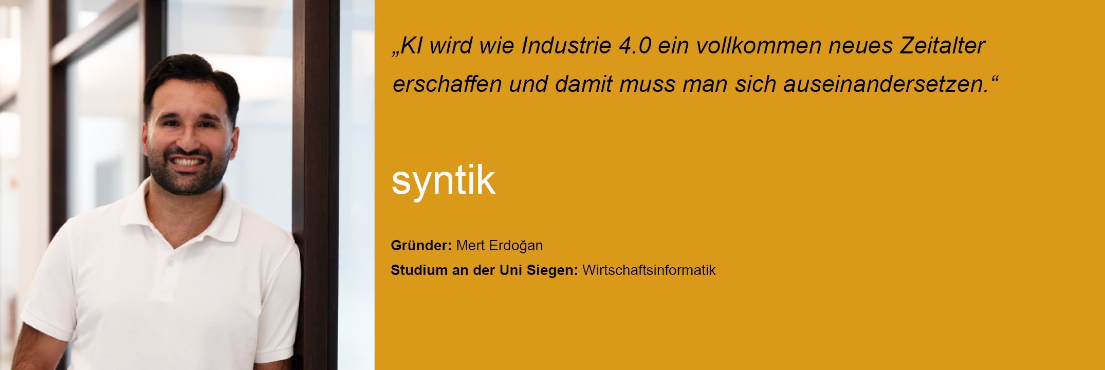 Der gebürtige Siegerländer Mert Erdoğan ist der Gründer des Start-Ups „syntik gmbH“. In seinen KI-Workshops lehrt er nicht nur die KI-Grundlagen, sondern vermittelt mittelständischen Unternehmen auch, wie sie durch die gerechte Nutzung von Artifical Intelligence profitieren können.
