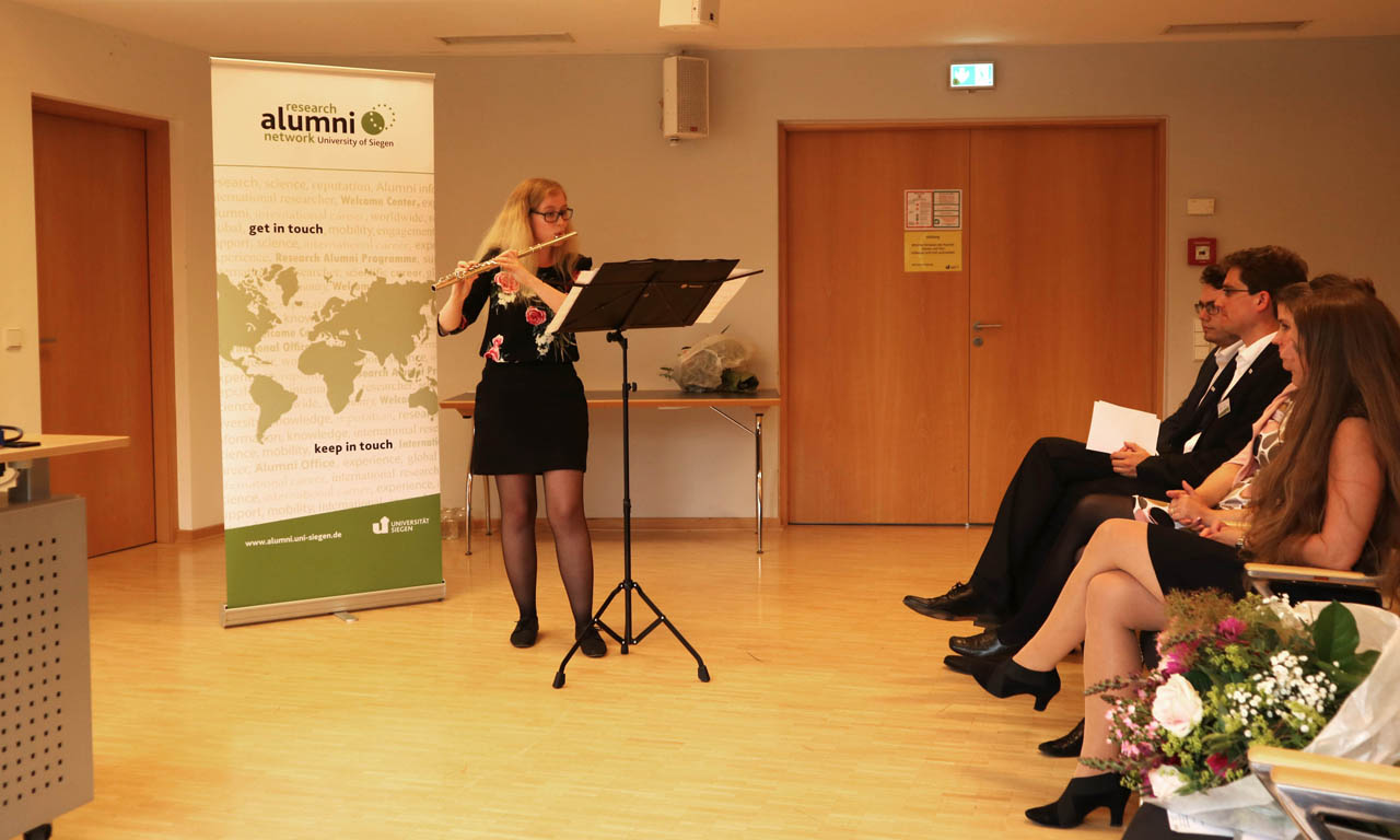 Nach der Ehrung tauschten sich die Forschenden und Gäste bei einem sommerlichen Steh-Empfang aus. Auch ihre Familien waren herzlich willkommen. Der Ukrainer Alex Boyko war mit seiner Ehefrau gekommen, auch um andere Wissenschaftler/innen kennenzulernen. Boyko forscht im Bereich Hydrologie und Hochwasser. „In diesem sehr speziellen Forschungsfeld hat die Uni Siegen einen überragend guten Ruf“, berichtete er. Boyko und seine Frau sind seit eineinhalb Jahren in Deutschland. Sie kommen aus der Großstadt Kiew, deshalb kommt ihnen Siegen angenehm klein, grün und ruhig vor. Die beiden schätzen auch die Lage der Stadt innerhalb Europas. „Wir reisen sehr gern. Siegen liegt so zentral, dass wir super schnell mit dem Zug in anderen europäischen Städten sind. Das ist genial“, sagte Boyko.