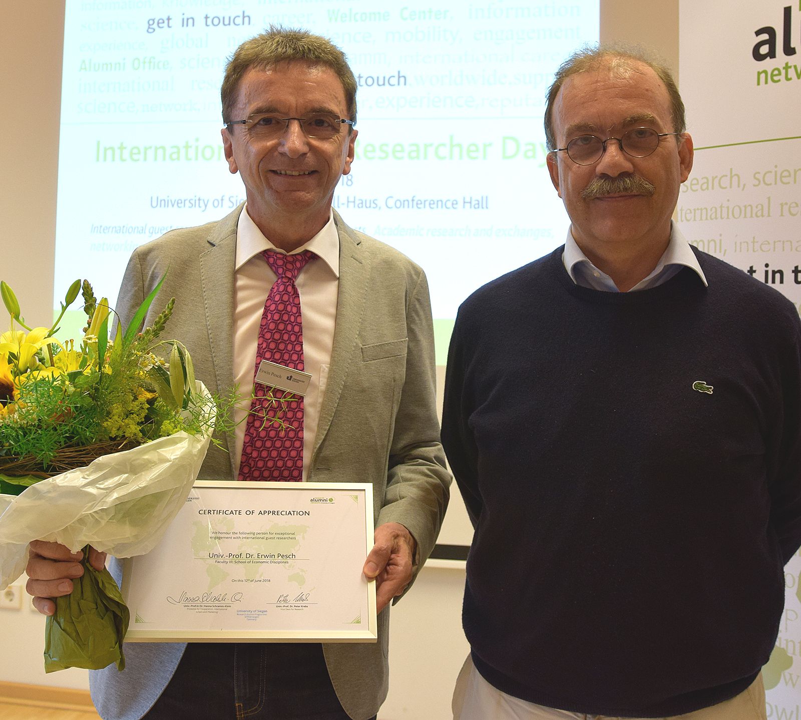 Erstmalig fand am 12. Juni der erste International Guest Researcher Day an der Universität Siegen statt, zu dem das Programm Forscher-Alumni in Kooperation mit dem International Welcome Center sowie dem Alumniverbund der Universität Siegen geladen hatte. Im Mittelpunkt standen der Austausch und die Forschung der internationalen Gastwissenschaftler/innen und deren Siegener Gastgeber/innen aus allen Fakultäten.Der International Guest Researcher Day bildete den Rahmen für den inzwischen dritten Jahresempfang des Welcome Centers für internationale Gastwissenschaftler/innen und einer Würdigung ausgewählter Siegener Wissenschaftler/innen für ihr Engagement für internationale Zusammenarbeit sowie deren Forschungskooperationen mit internationalen Wissenschaftler/innen sowie einer Konferenz zum Thema Wissenschaftskommunikation.