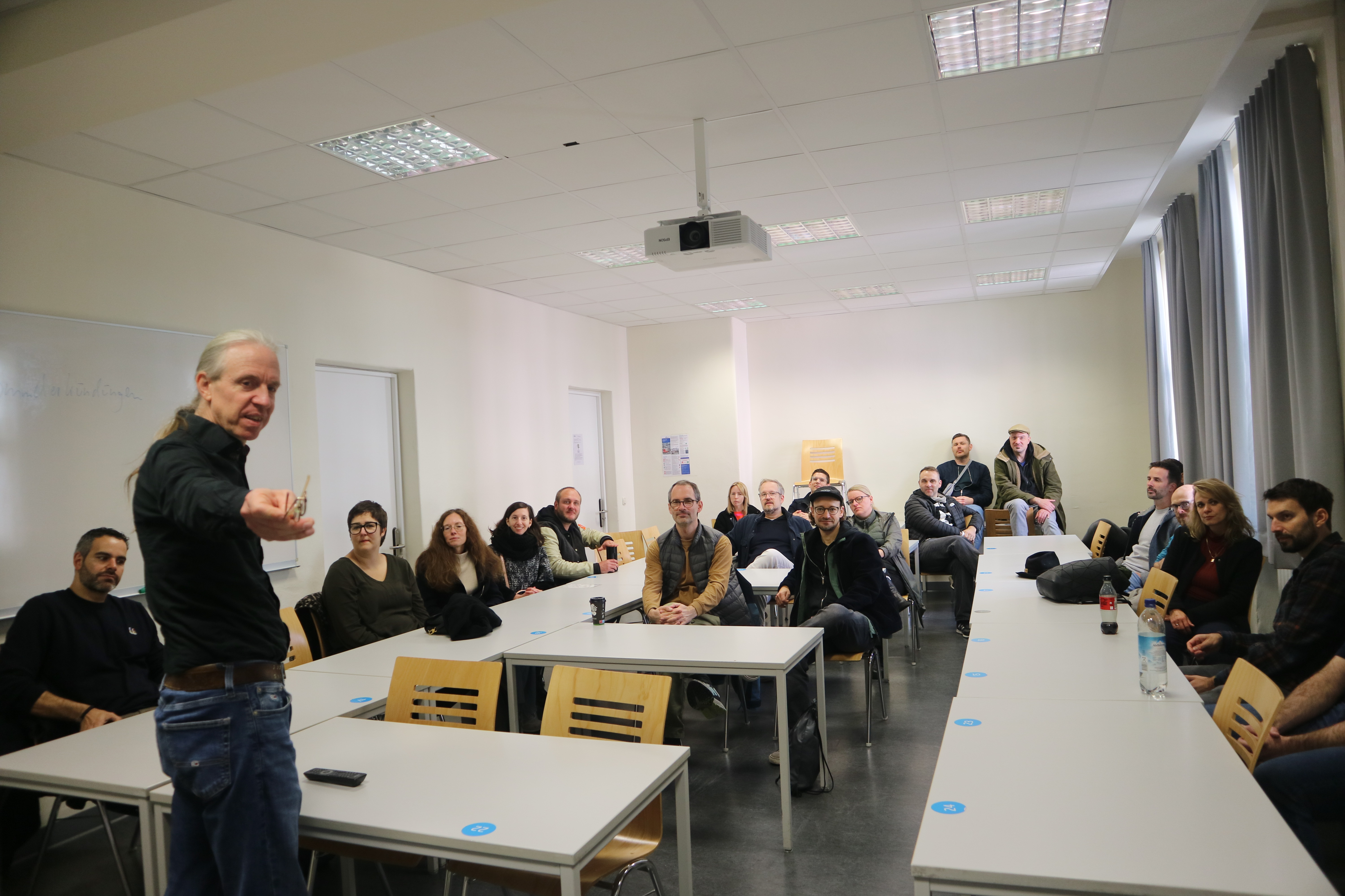 Für die ehemaligen „M-PEB’ler“ ist es eine besondere Freude, im Anschluss des Besuchs im Herrengarten, einen Streifzug über ihren damaligen Studienstandort, den AR-Campus, zu unternehmen. Sie laufen noch einmal durch die Flure auf der vierten und sechsten Etage von K-Turm, um die Erinnerungen an die gemeinsame Studienzeit wiederaufleben zu lassen, bevor es dann zur „Abschlussveranstaltung“ in den Roten Hörsaal geht.
