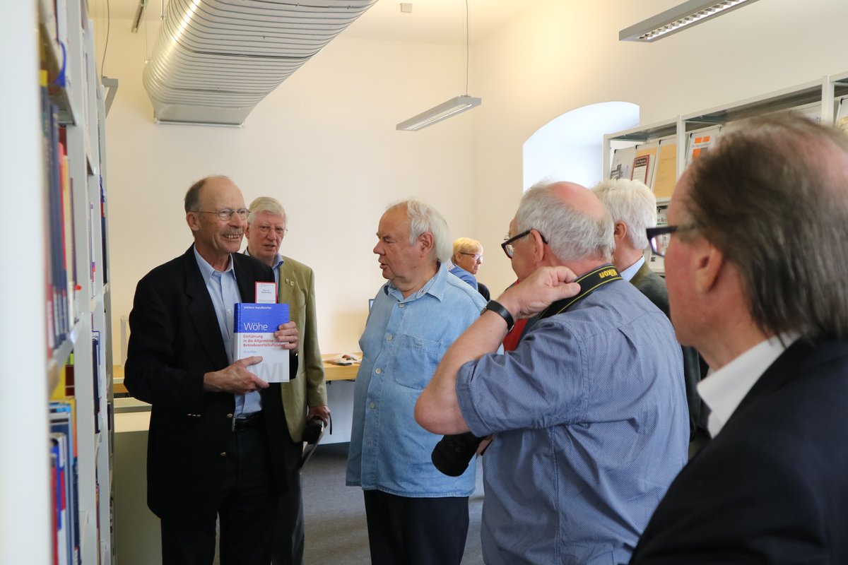 Verbunden mit der persönlichen Gratulation überreichte der Prodekan auch im Namen des Rektors den Alumni Urkunden zu ihrem 50. Examensjubiläum – eine Geste, worüber sich die Jubilare sehr freuten! Im Anschluss stand selbstverständlich der Rundgang durch die neuen Gebäude des Campus Unteres Schloss auf dem Programm. PD Dr. Michael Gail, Geschäftsführer der Fakultät, führte die Alumni durch die historischen Gebäude, die vor dem Einzug der Uni als ehemaliger Sitzes des Siegener Arbeitsgerichts und anderer öffentlicher Verwaltungen, dienten. Die Leiterin der Teilbibliothek, Marion Stahl-Scholz, die sich inzwischen im Wittgensteiner Flüges des ehemalige Schlosses befindet, nahm die Herren weiter mit auf Entdeckungsreise durch die neue Teilbibliothek, in der ehemals die Nebenstelle der JVA-Attendorn untergebracht war. Beim weiteren Rundgang durch die auf zwei Etagen aufgestellte Teilbibliothek erklärte Marion Stahl-Scholz u.a. das dort zur Verfügung stehende moderne System der Buchausleihe und -rückgabe. Beim Durchschlendern der Bibliothek entlang der insgesamt 100.000 Fachbücher freuten sich die Alumni außerdem über Entdeckungen von Autorennamen ehemaliger Professoren oder Klassiker wie z.B. den „Wöhe“, die die Alumni bereits vor 50 Jahren durch ihr Studium begleiteten. Ein Highlight der Führung, das nicht fehlen durfte, war nicht zuletzt die Besichtigung eines vormals als Zelle genutzter Raum. Die Rundführung durch die Gebäude hinterließ bei allen Alumni großen Eindruck.