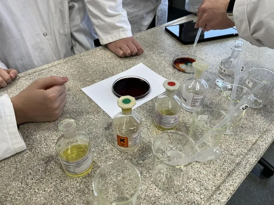 - Tropfe auf jedes Uhrglas vorsichtig eine der Säuren zu, bis die Blätter mit der Lösung bedeckt sind.