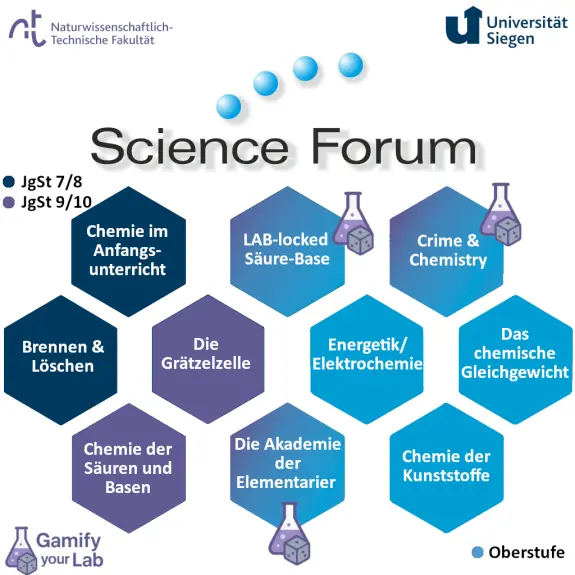 Das Science Forum ist das Chemie-Schülerlabor der Universität Siegen. Vor über 25 Jahren gegründet, ist es eines der ersten Schülerlabore seiner Art. Es ist ein besonderer außerschulischer Lernort für Schülergruppen aus der Region. In einer authentischen Laborumgebung können sie über zwanzig verschiedene experimentelle Praktika absolvieren. Dabei werden sie eng betreut, lernen die Arbeit im Labor kennen und erleben einen motivierenden Zugang zu naturwissenschaftlichem Arbeiten.
