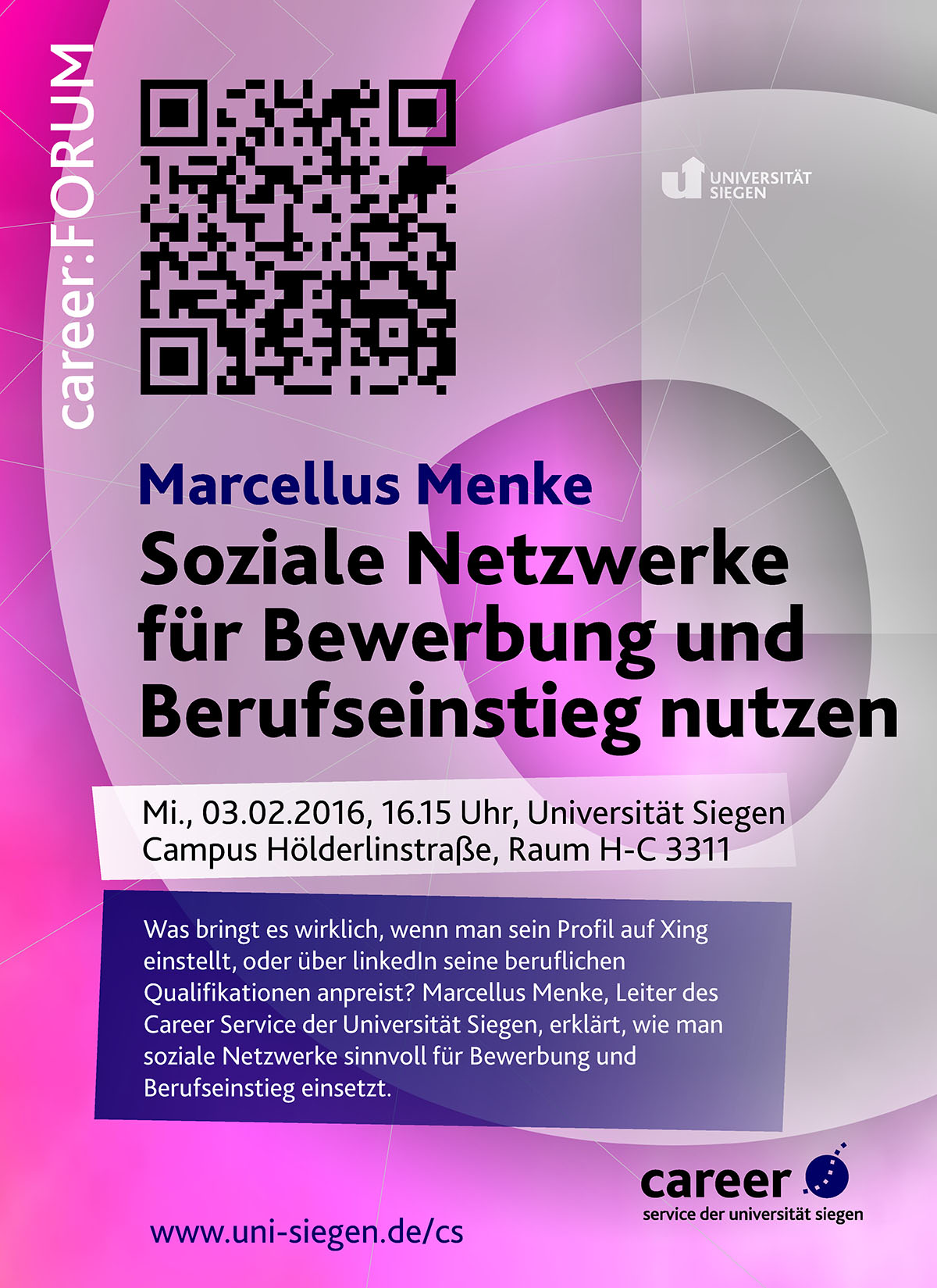 Doch was bringt es wirklich, wenn man sein Profil auf Xing einstellt, oder über linkedIn seine beruflichen Qualifikationen anpreist. Marcellus Menke, Leiter des Career Service der Universität Siegen, und seit über 10 Jahren im Bereich berufliche Orientierung für Studierende tätig, erklärt, wie man soziale Netzwerke sinnvoll für Bewerbung und Berufseinstieg nutzt. Er stellt die Dos and Don'ts vor und gibt Tipps für einen souveränen und zielführenden Umgang mit den elektronischen Medien. Er erklärt, welche Informationen man präsentieren sollte und welche Daten lieber in eine individuell verschickte persönliche Bewerbung gehören.