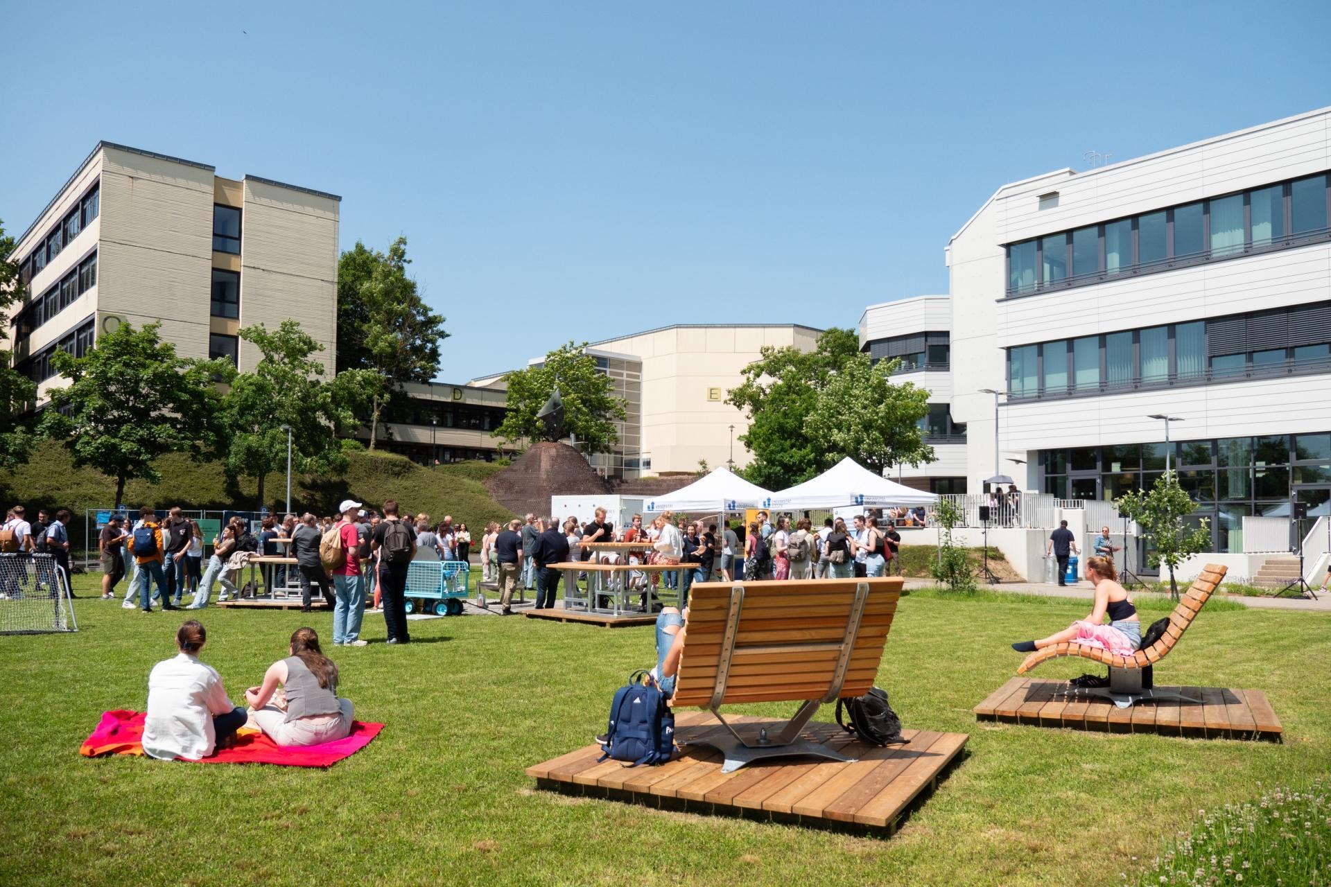 The former bistro meadow has become the LEOwiese: a meeting place for all members of the university and a place to linger, chat, play and exercise. "As the Rectorate, we are strongly committed to improving the quality of life at the University of Siegen. The aim is for the campus to be a place where students and employees enjoy spending time - even after lectures or work. The LEOwiese is a wonderful place for this," said Rector Prof. Dr. Stefanie Reese at the opening party.