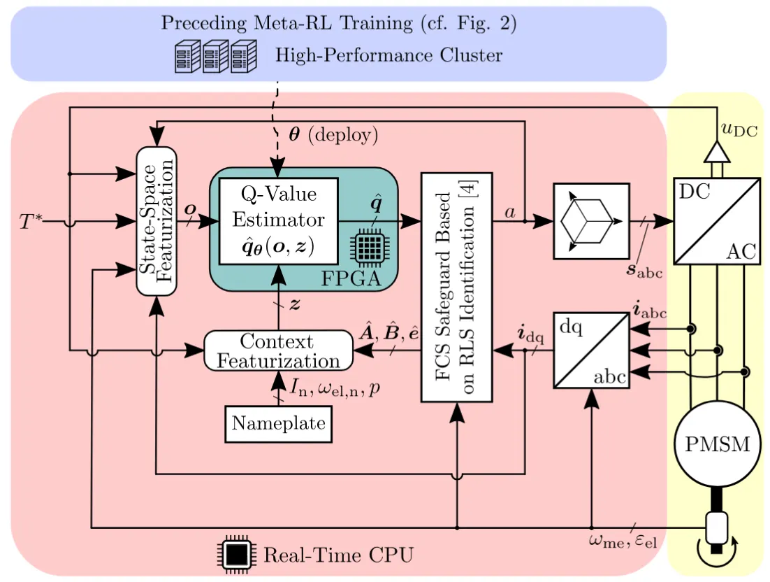 Together with our partners at the University of Paderborn, we recently published an article in IEEE Transactions on Power Electronics entitled “Universal Direct Torque Controller for Permanent Magnet Synchronous Motors via Meta-Reinforcement Learning.” The article addresses highly automated controller synthesis for any permanently excited synchronous drives and demonstrates how a control strategy learned using data-driven algorithms can be transferred from simulative training to real-world laboratory applications. The methodology and empirical investigation presented represent an important step toward the autonomous commissioning of power electronic systems in heterogeneous application contexts in order to achieve optimal system performance with minimal (human) effort.