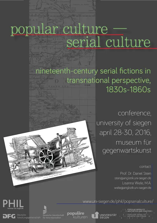 Recent publications such as Transnationalism and American Serial Fiction (Okker 2011) and Serialization in Popular Culture (Allen/van den Berg 2014) remind us that serial modes of storytelling, publication, and reception have been among the driving forces of modern culture since the first half of the nineteenth century. Indeed, as studies of Victorian serial fiction, the French feuilleton novel, and American magazine fiction indicate, much of what we take for granted as central features of contemporary serial fictions traces back to a particular period in the nineteenth century between the 1830s and the 1860s. This is the time when new printing techniques allowed for the mass publication of affordable reading materials, when literary authorship became a viable profession, when reading for pleasure became a popular pastime for increasingly literate and socially diverse audiences, and when previously predominantly national print markets became thoroughly international.