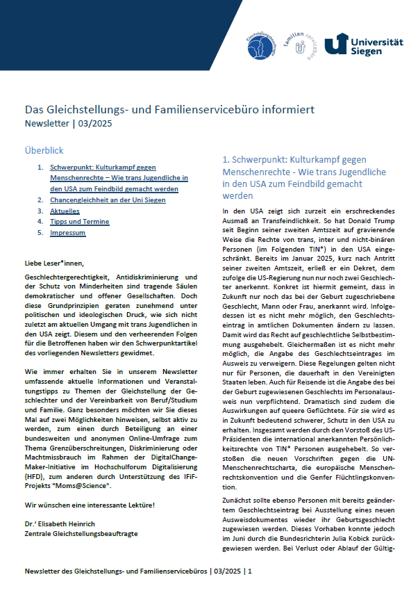 Newsletter | 03/2020 Themen - Schwerpunkt: Ausbau der Gender Studies an der Universität Siegen