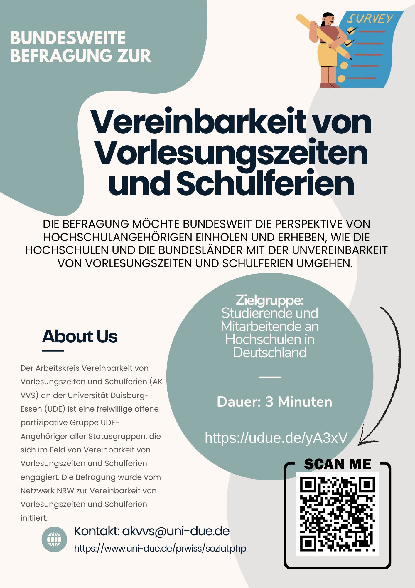 Verantwortlich für die Umfrage ist der Arbeitskreis Vereinbarkeit von Vorlesungszeiten und Schulferien (AK VVS) an der Universität Duisburg-Essen (UDE). Initiiert wurde sie vom Netzwerk NRW zur Vereinbarkeit von Vorlesungszeiten und Schulferien. Beide Gruppen arbeiten daran, das Bewusstsein und die Informationen zu diesem Thema zu schärfen, mit dem Ziel, einen Beitrag zur Suche nach Lösungen zu leisten, die die derzeitige Situation verbessern. Die Befragung möchte bundesweit und übergreifend alle Hochschulangehörigen (Universitäten, HAW, Hochschulen der Künste…) und dabei alle Statusgruppen ansprechen und die Perspektiven zu diesem Thema einholen.
