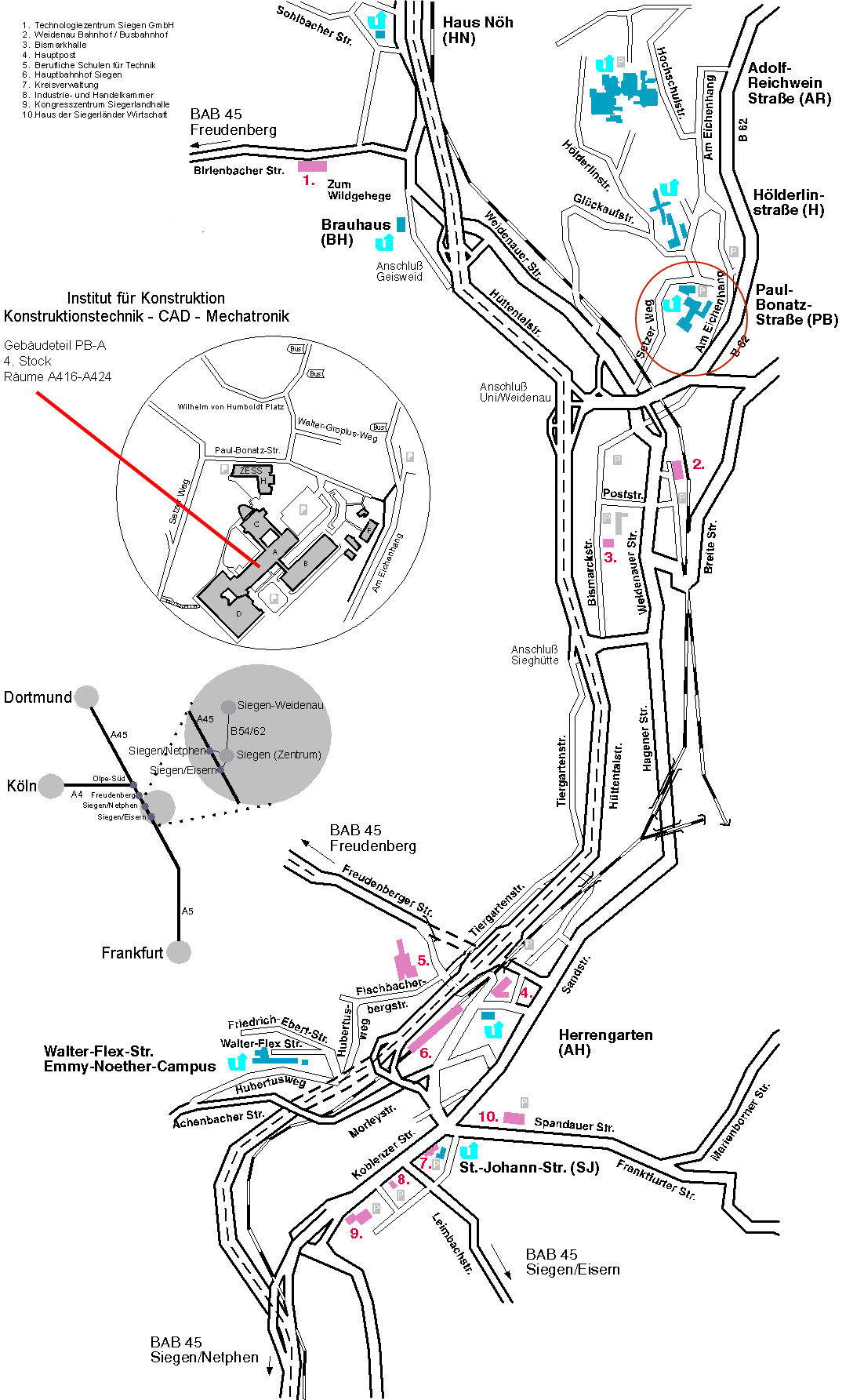 Die Universität Siegen befindet sich in Weidenau, einem Stadtteil von Siegen. Mit dem Auto erreichen Sie Siegen am besten über die A45 (siehe Lagepläne). Der Bahnhof Siegen-Weidenau ist von Hagen oder Frankfurt mit einem 2stündlich verkehrendem Interregio, oder von Köln mit einem stündlich verkehrendem Nahverkehrszug zu erreichen.