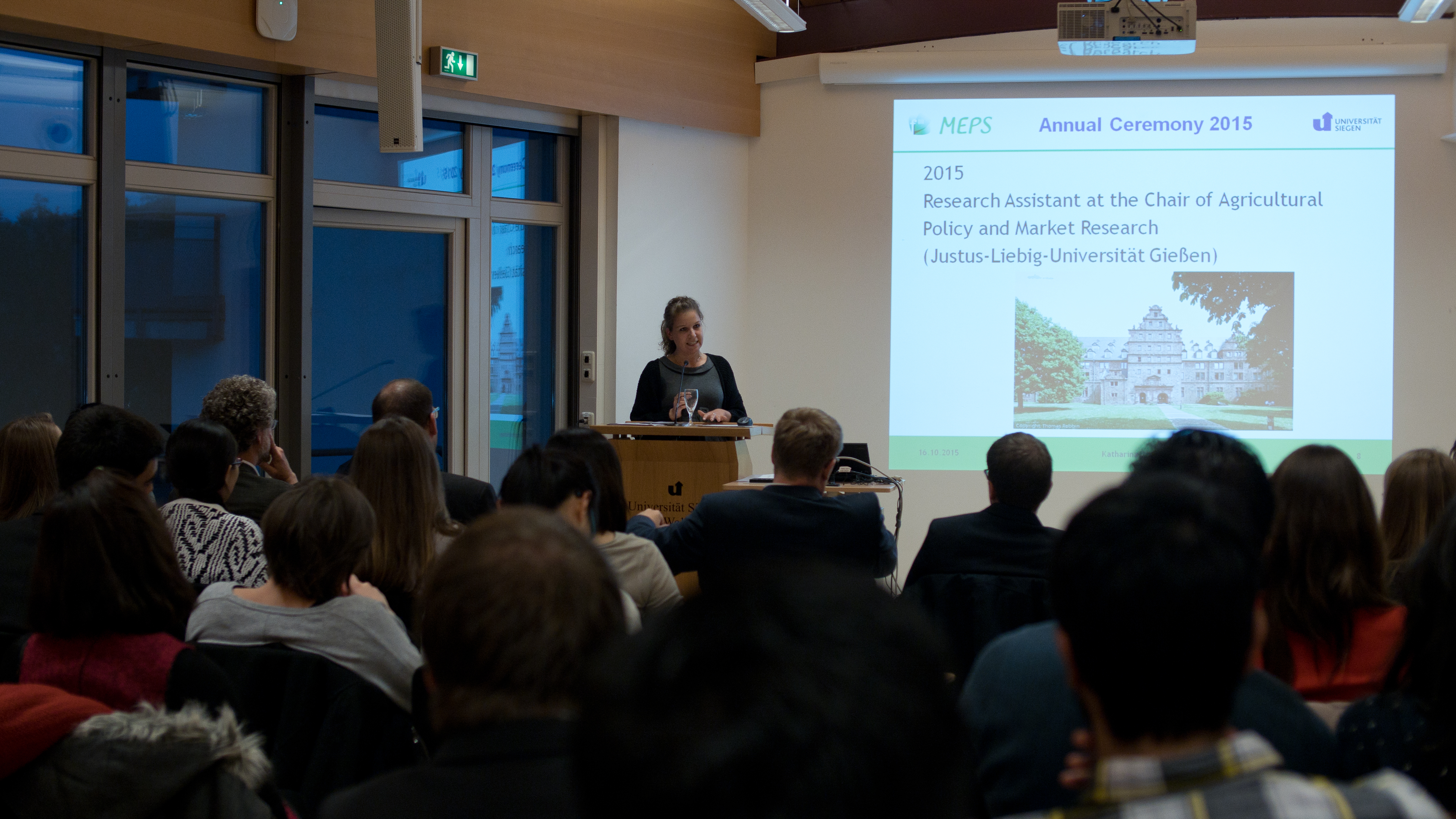 After the welcome address of Professor Koch, the director of the MEPS program, Aliaxandra Hutsko and Katharina Bissinger took the stage. Both alumni, one working in a consulting company in Düsseldorf and the other one doing a PhD in Economics in Gießen, talked about their experiences during their studies. Moreover, they presented insights into their actual job life and how they accomplished to come so far. Their presentation was particularly directed to the freshmen and current MEPS students as a big motivator for the wide range of different job prospects after the studies.