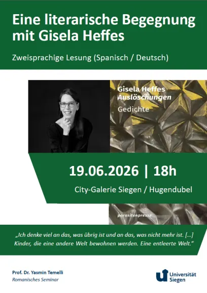 Eine literarische Begegnung mit Gisela Heffes 28.04.2026 Zweisprachige Lesung (Spanisch / Deutsch) aus dem Gedichtband "Auslöschungen" Am 19.06.2026 liest Gisela Heffes aus ihrem Gedichtband "Auslöschungen" Ansprechpartner Univ.-Prof. Dr. Yasmin Temelli Professor*in Yasmin.Temelli@uni-siegen.de +49 271 740-4577