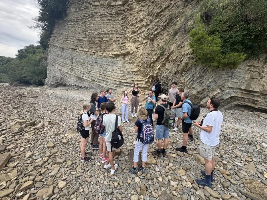 Prof. Dr. Volker Heck (Didaktik der Geographie) erläutert die besondere Gesteinsformation Flysch einer Gruppe von Schülerinnen und Schülern des Gymnasium Ledina aus Ljubljana auf einer Exkursion.