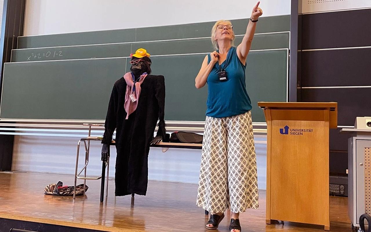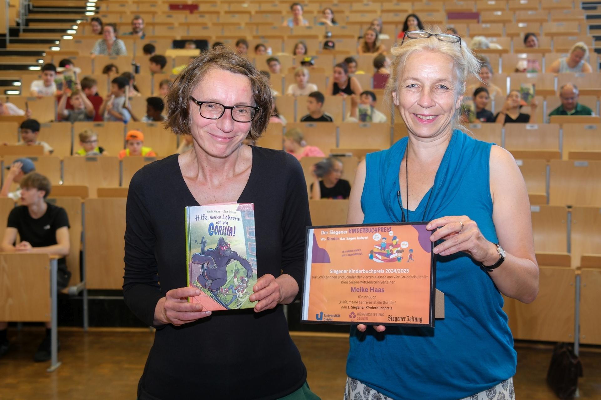 Hochspannung im Audimax der Universität Siegen: Rund 100 Viertklässler*innen waren in den größten Hörsaal auf dem Haardter Berg gekommen, um zu erfahren, welches Buch beim Siegener Kinderbuchpreis das Rennen gemacht hatte. Der Preis ist eine gemeinsame Aktion von Bürgerstiftung Siegen, Siegener Zeitung und Universität Siegen und wurde jetzt zum ersten Mal verliehen. Das Besondere: Die Kinder selbst entscheiden über das Gewinnerbuch. Das Ergebnis der Abstimmung blieb jedoch zunächst streng geheim – und wurde erst bei der Lesung im Uni-Hörsaal gelüftet. Mit großem Jubel reagierten die Schüler*innen, als sie die ersten Zeilen des Buches „Hilfe, meine Lehrerin ist ein Gorilla“ erkannten: Mit überwältigender Mehrheit hatten sie für das Buch gestimmt.