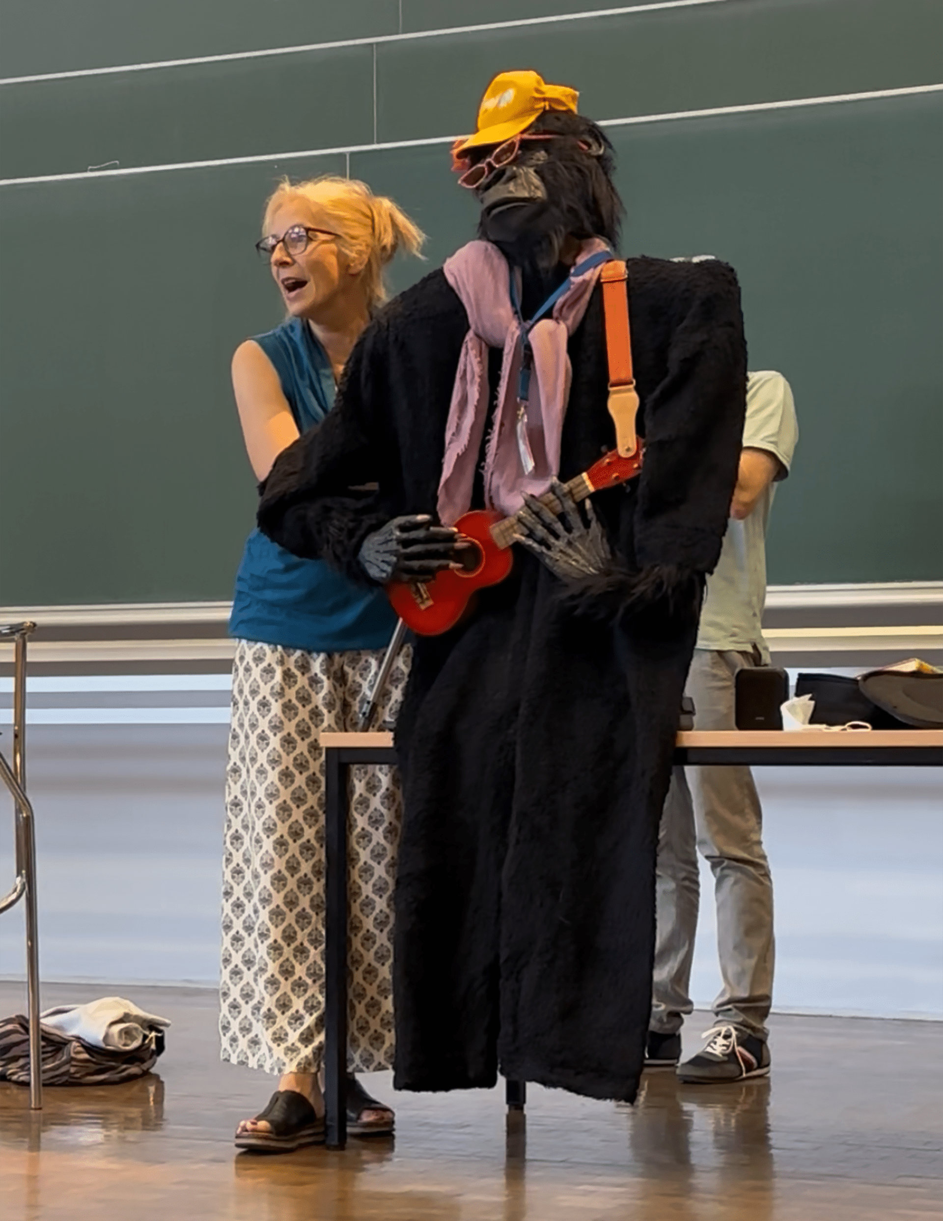 In ihrer anschließenden Lesung bereitete Haas den Kindern dann auch jede Menge Spaß und Freude mit „ihrem“ Siegerbuch: Immer wieder wurden die Schüler*innen mit einbezogen, durften selbst Vorschläge machen, welche Wendungen die Geschichte um den 11jährigen Milo und seine Lehrerin, die sich in einen Gorilla aus seinem Computerspiel verwandelt, auch hätte nehmen können. Als Höhepunkt ließ Haas die Gorilla-Lehrerin auf der Bühne lebendig werden: In Form einer lebensgroßen Affen-Puppe, ausgestattet mit sämtlichen Accessoires aus dem Buch, bis hin zur knallroten Lehrerinnen-Brille und einer Ukulele.