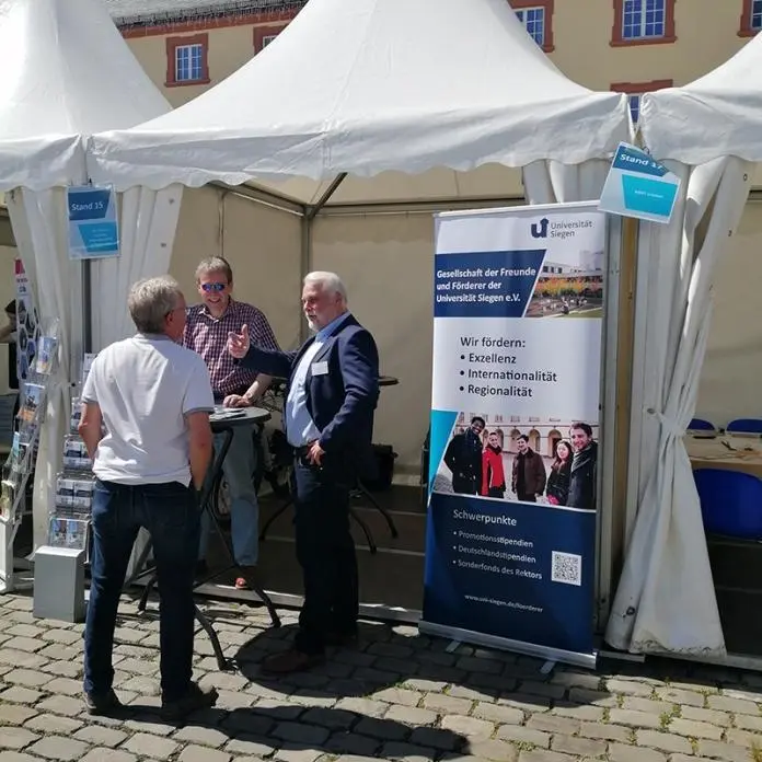 Tag der Offenen Uni 04.06.2024 Sandro Abbate Informationsstand am Tag der offenen Uni am 14. Mai 2022 auf dem Schlossplatz am Campus Unteres Schloss. © GFF Vorstandsmitglied Christoph Venohr und Geschäftsführer Roger Schmidt © GFF Geschäftsführer Roger Schmidt und Vorstandsmitglied Christoph Held © GFF Geschäftsführer Roger Schmidt und Assistentin Anita Send