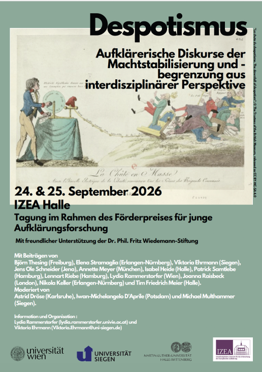 Zur Beredsamkeit von Despot und Untertan. Aufklärerische Rhetorik top-down/bottom-up. Workshop Despotismus. Aufklärerische Diskurse der Machtstabilisierung und -begrenzung aus interdisziplinärer Perspektive, Interdisziplinäres Zentrum für die Erforschung der Europäischen Aufklärung, Halle (September 2026; Workshoporganisation Lydia Rammerstorfer und Viktoria Jähnchen).