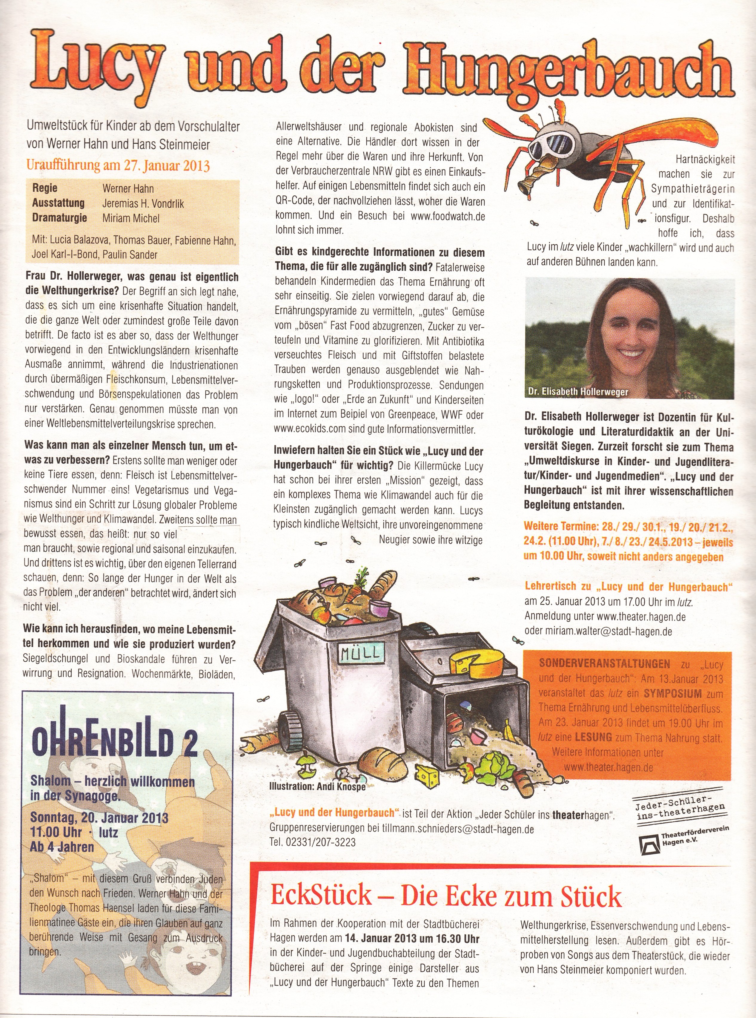 Das Umwelttheaterstück Lucy und der Hungerbauch feierte am 27.1.2013 am Theater Hagen Premiere. Wir waren von Anfang an hinter den Kulissen an der Entstehung beteiligt. Hier gibt es einen Ausschnitt aus der