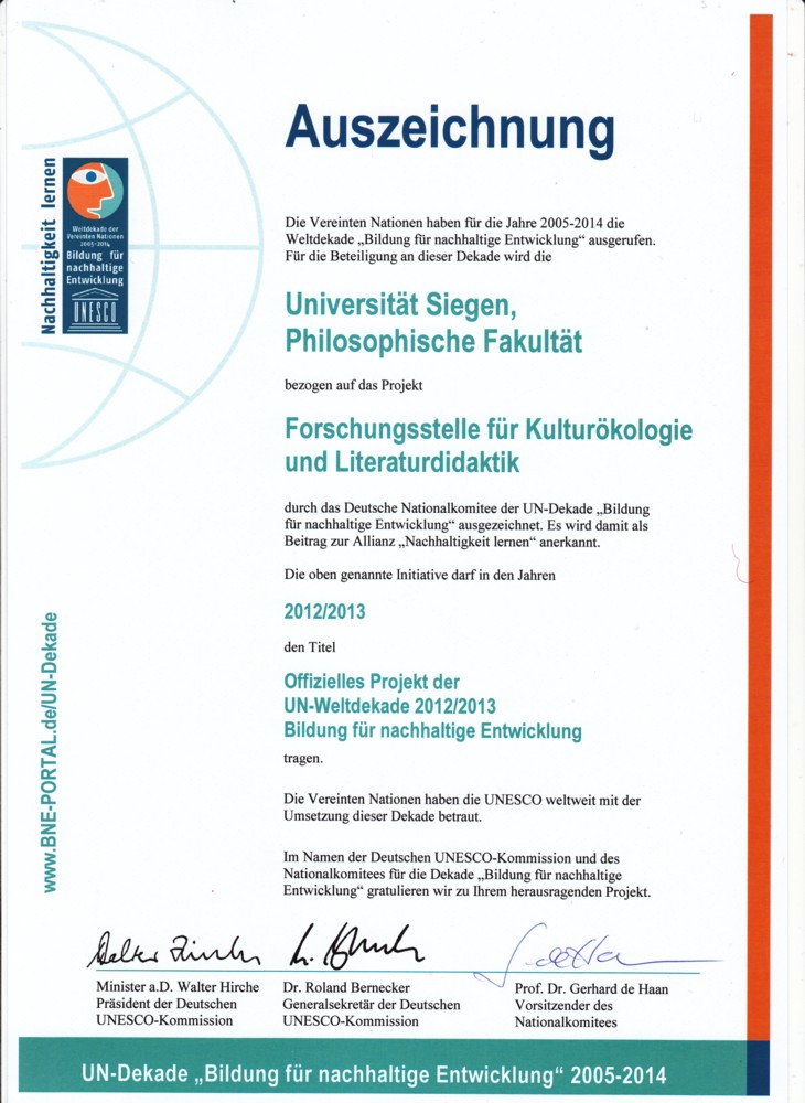 Am 21. September 2012 wurde unsere Forschungsstelle im Rahmen der Auftaktveranstaltung für die bundesweiten Aktionstage der UN-Dekade "Bildung für nachhaltige Entwicklung" (21.-30.9.) als offizielles Dekadeprojekt 2012/2013 ausgezeichnet.