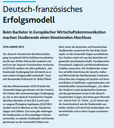 Der Runde Tisch zum Austausch zu Aktivitäten und Kooperationen mit der Université d'Orléans findet in der Regel einmal pro Semester statt. Sollten Sie Interesse an der Teilnahme haben, melden Sie sich bitte bei katharina.sommer@zv.uni-siegen.de.