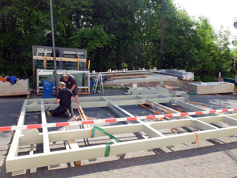 ganztägig gesperrt. Mit einem 30-Tonnen-Kran muss die Musterfassade auf einen Betonsockel gehoben werden. Über eine Hub-Bühne werden anschließend die Fassaden-Elemente angebracht. An ihrem Platz gegenüber dem NB-Gebäude kann die Fassade dann mehrere Wochen lang von allen Interessierten betrachtet werden.