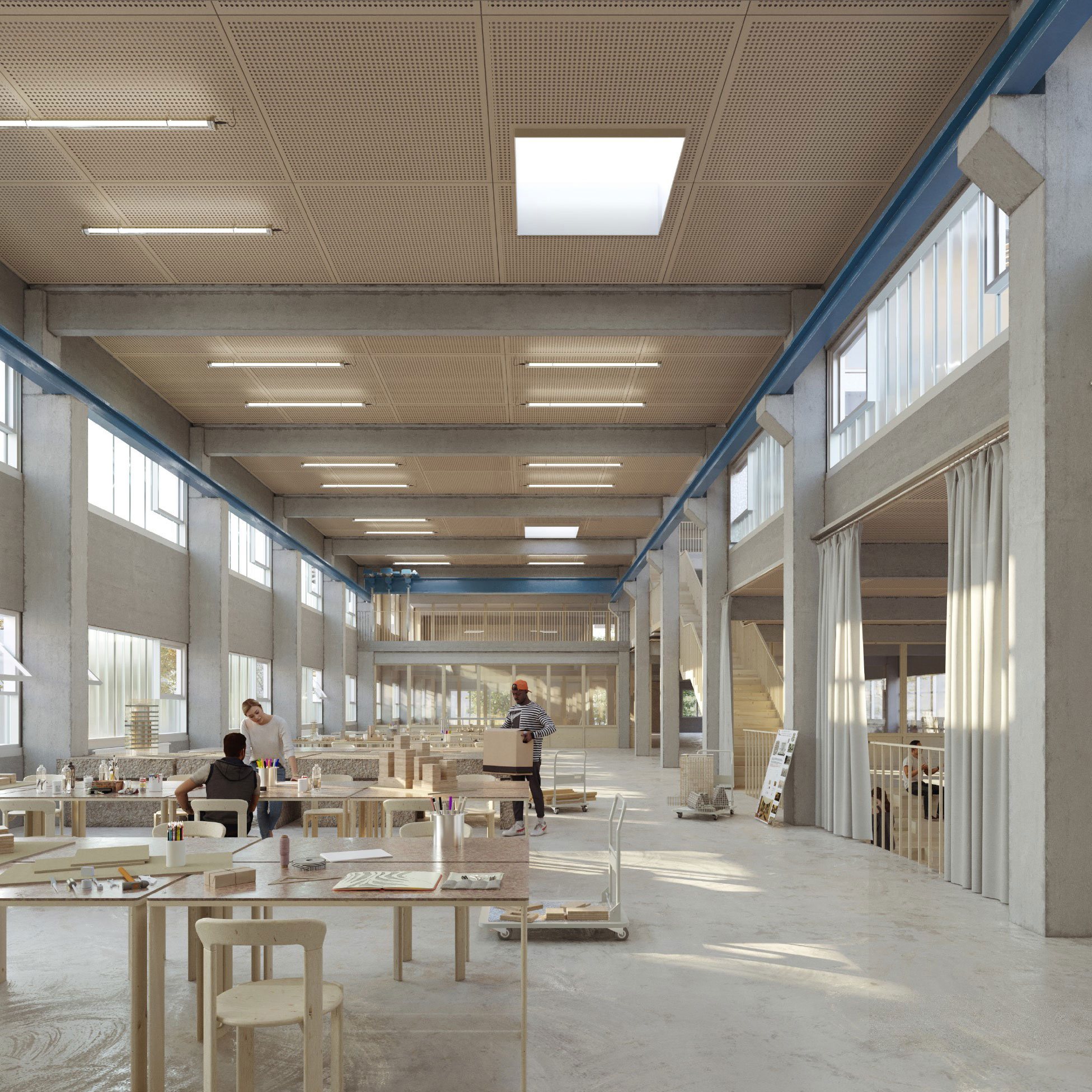 - FAKT/Gustav Düsing: Der Entwurf versucht, möglichst sparsam mit Material umzugehen. Tragwerke sind schlank gehalten, feine Ergänzungen entstehen. Ein neues, zusätzliches Dach in Parabolform gibt dem Gebäude einen gänzlich anderen Charakter, sodass eine neue Ästhetik des Gebäudes entsteht.