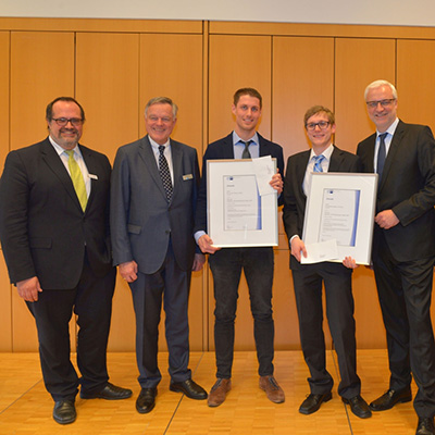 Dr. Thomas Ludwig und Eric Reimann von der Uni Siegen haben eines gemeinsam: Ihre Dissertation bzw. Masterarbeit bekam jeweils die Bestnote. Jetzt wurde ihnen zudem für ihre herausragende wissenschaftliche Leistung der 32. „IHK-Preis“ verliehen. Felix G. Hensel, Präsident der Industrie- und Handelskammer Siegen, überreichte die mit insgesamt 4.000 Euro dotierte Auszeichnung gemeinsam mit Gunnar Kohlschein von der BGH Edelstahlwerke GmbH und Wilhelm Rücker von der Sparkasse Olpe-Drolshagen-Wenden. BGH und die Sparkasse haben den IHK-Preis 2017 gestiftet.