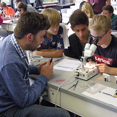 Konzentriert beugen sich die Jungen und Mädchen über die Mikroskope. Unter der Linse bewegen sich nur wenige Millimeter große Tierchen: Die einheimische Schmalbrustameise „Temnothorax nylanderi“. Normalerweise lebt sie in Kolonien in ausgehölten Eicheln oder dünnen Stöckchen. Für die Experimente im Ameisenlabor haben die SchülerInnen die Ameisen in kleine Plastik-Apartments umgesiedelt. A.N.T.S. (Ameisenforschung als neues Thema an Schulen) nennt sich das Projekt. An der Uni Siegen wird es im Rahmen des Seminars „Biologie eusozialer Insekten“ von Prof. Dr. Klaudia Witte und den Lehramtsstudierenden organisiert und durchgeführt. 24 SiebtklässlerInnen der Gemeinschaftsschule Burbach haben jetzt daran teilgenommen.