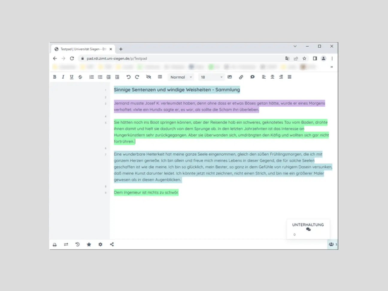 Etherpad ist ein webbasierter Texteditor, der es mehreren Personen erlaubt, gleichzeitig und in Echtzeit ein Dokument zu bearbeiten, ähnlich wie bei Google Docs, aber als Open-Source-Lösung. Jede mitwirkende Person erhält eine eigene Farbe, um ihre Beiträge zu unterscheiden. Es gibt eine Chatfunktion sowie eine Versionshistorie, um Änderungen nachzuvollziehen, was es ideal für Gruppenarbeit, Mitschriften, Brainstorming und gemeinsame Textentwicklung macht.
