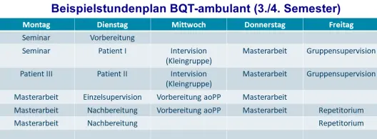 Beispielhafter Ablauf des ambulanten Praktikums (2KLIMA09): Sie beteiligen sich nicht nur an den Patientengesprächen, vielmehr bereiten Sie Sitzungen eigenständig vor. Die Nachbereitung erfolgt mit dem:r jeweilig zugeordneten Lehrtherapeut:in. Jede:r Lehrtherapeut:in hält einmal wöchentlich eine Gruppensupervision. Die gleiche Gruppe der Studierenden organisiert zudem einmal wöchentlich eine Intervisionsgruppe. Abgerundet wird der Theorie-Praxis-Transfer durch eine intensive Vorbereitung auf die Approbationsprüfung (2KLIMA06). Das Repetitorium wiederholt Inhalte und stellt Prüfungsanforderungen nach.